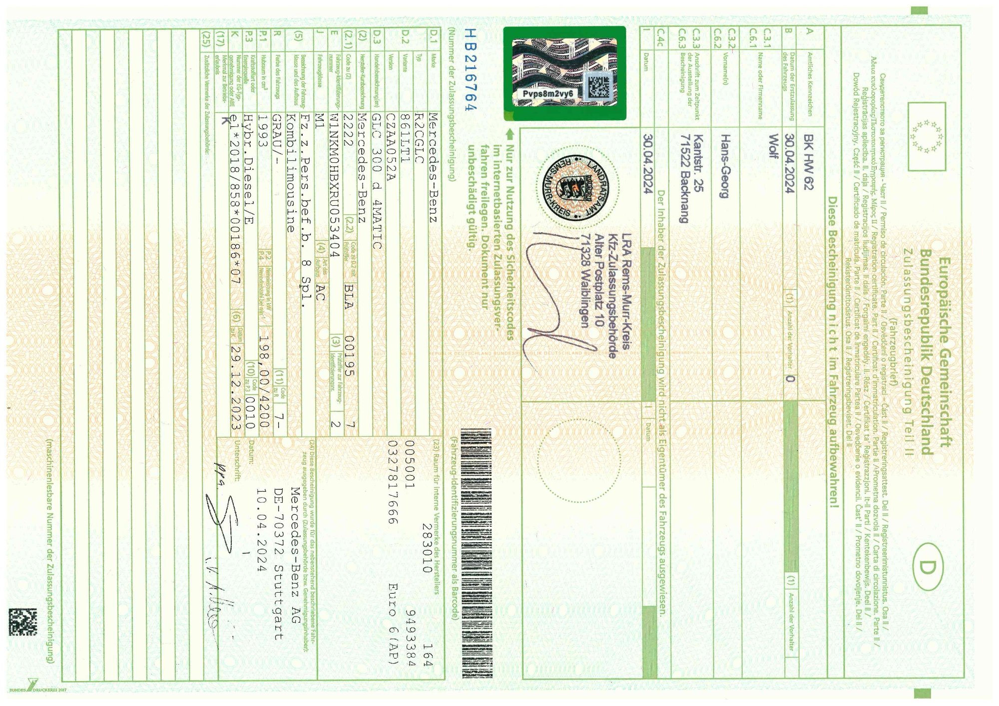 Erstzulassung 30.04.2024 -