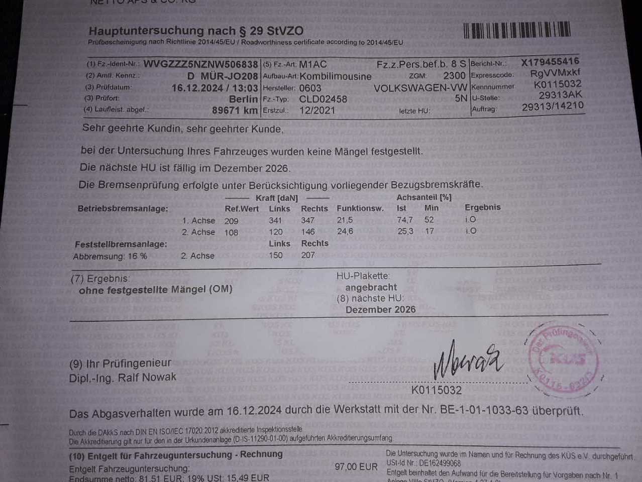 Fahrzeug-Identifikationsnummer (VIN) ***************** -